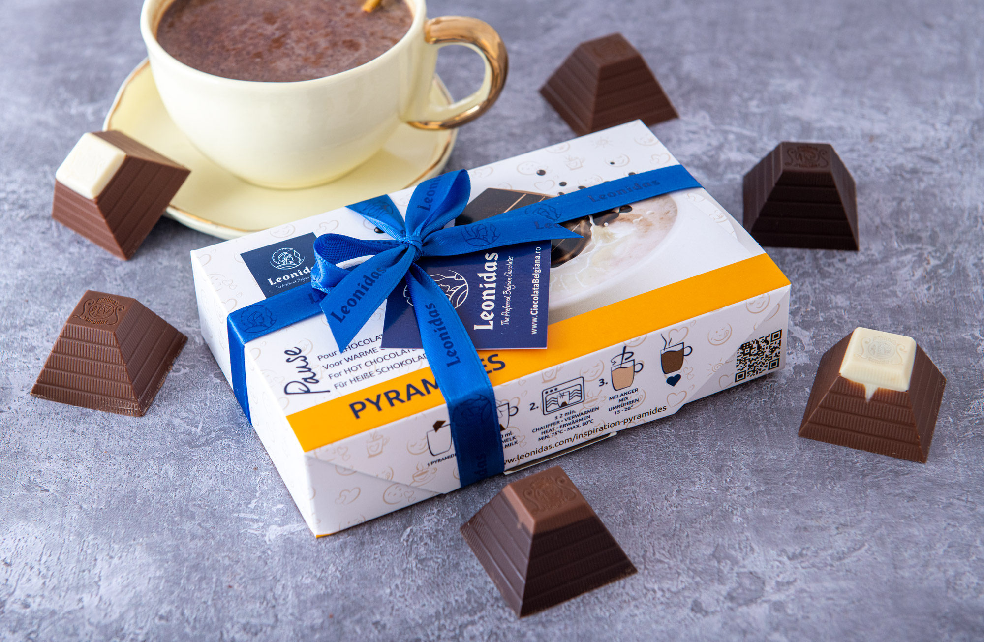 Piramidele din ciocolată belgiană, de la Leonidas, se prepară imediat, în aproximativ 2-3 minute și trebuie doar să încălzești 200ml de lapte, apoi să adaugi piramida și să amesteci până când aceasta se dizolvă. Până și procesul realizării ciocolatei calde este unul plăcut și vei putea observa etapele de dizolvare ale piramidei, de la stratul generos de ciocolată belgiană și până la interiorul cremos.